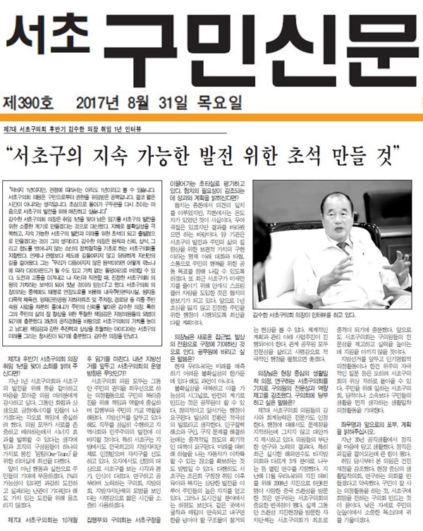 | 언론보도(제7대서초구의회 후반기 김수한의장 취임1년 인터뷰)2017.8.31 서초구민신문 | |||||