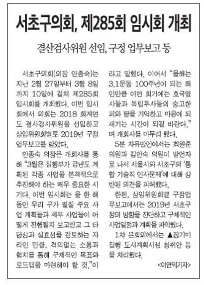 | 언론보도(서초구의회 제285회 임시회 개최) 2019.03.22 서초신문 | |||||