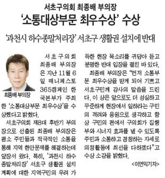 | 언론보도(서초구의회 최종배 부의장, 소통대상부문 최우수상 수상) 2020.12.09 서초신문 | |||||