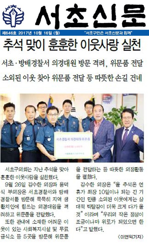 | 언론보도(추석맞이 훈훈한 이웃사랑 실천)2017.10.16 서초신문 | |||||