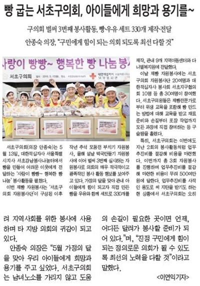 | 언론보도(빵 굽는 서초구의회, 아이들에게 희망과 용기를) 2019.05.30 서초신문 | |||||