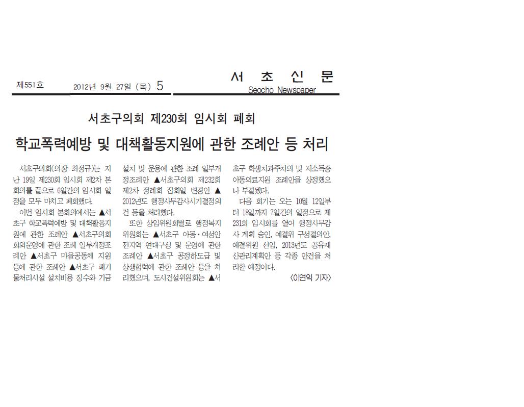 | 언론보도(제230회 임시회 폐회)서초신문 2012.9.27 | |||||