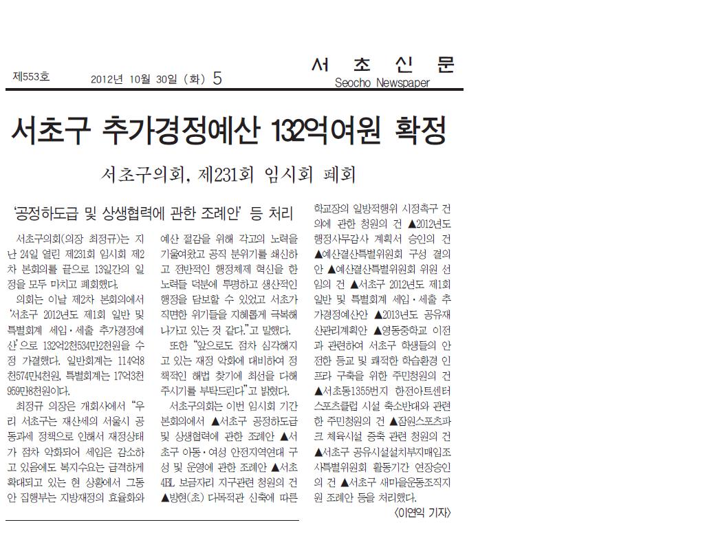 | 언론보도(제231회 임시회 폐회)서초신문 2012.10.30 | |||||