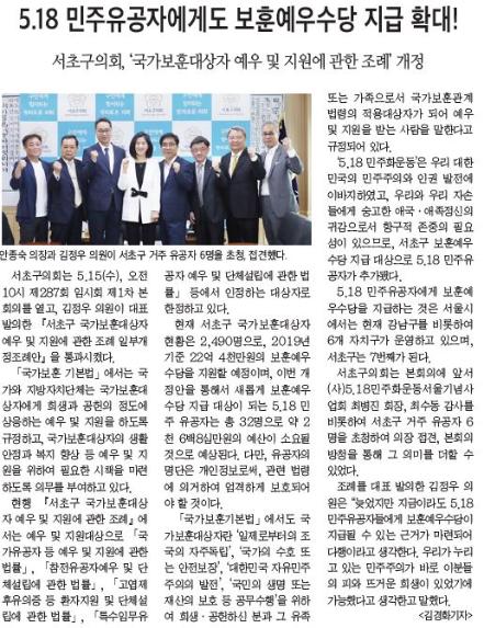 | 언론보도(5.18 민주유공자에게도 보훈예우수당 지급 확대!) 2019.05.30 서초신문 | |||||