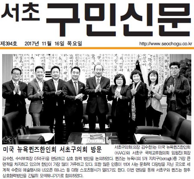 | 언론보도(미국 뉴욕퀸즈한인회 서초구의회 방문)2017.11.16 서초구민신문 | |||||