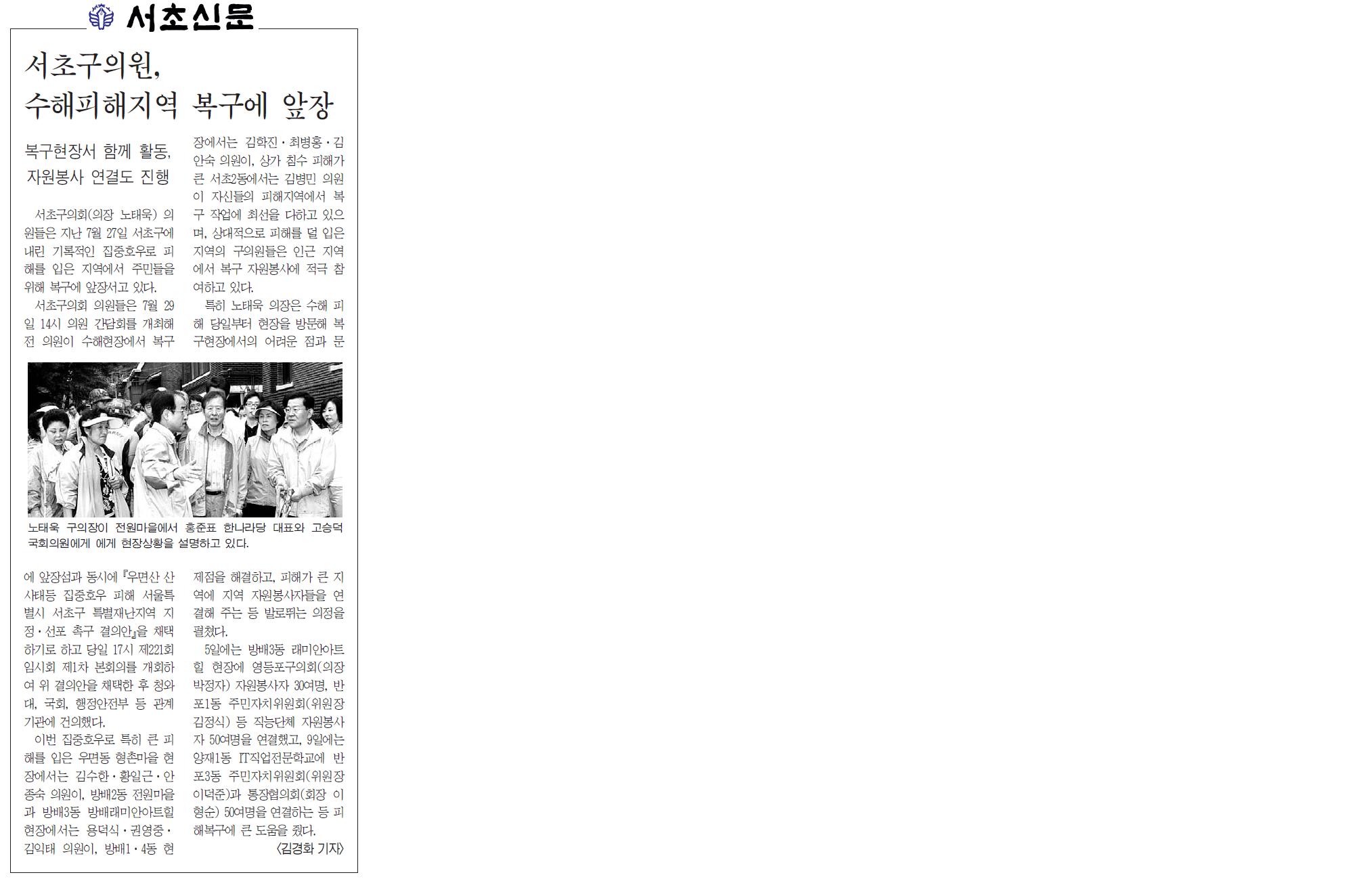 | 언론보도 - 서초신문(2011.8.11) - 서초구의원, 수해피해지역 복구에 앞장 |