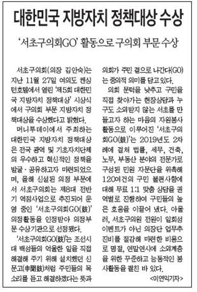 | 언론보도(대한민국 지방자치 정책대상 수상) 2020.12.09 서초신문 | |||||