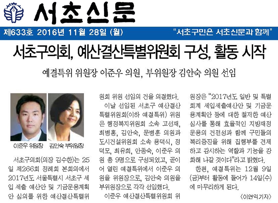 | 언론보도(서초구의회, 예산결산특별위원회 구성, 활동 시작) 2016.11.28 서초신문 | |||||