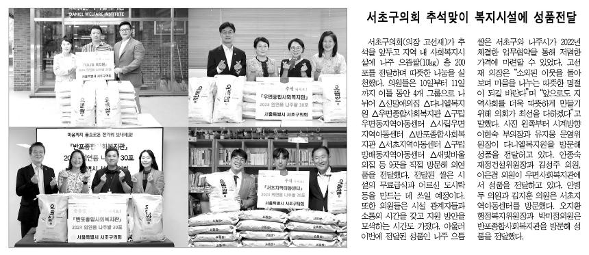 | 언론보도(서초구의회 추석맞이 복지시설에 성품전달) 2024.09.19 서초구민신문 | |||||