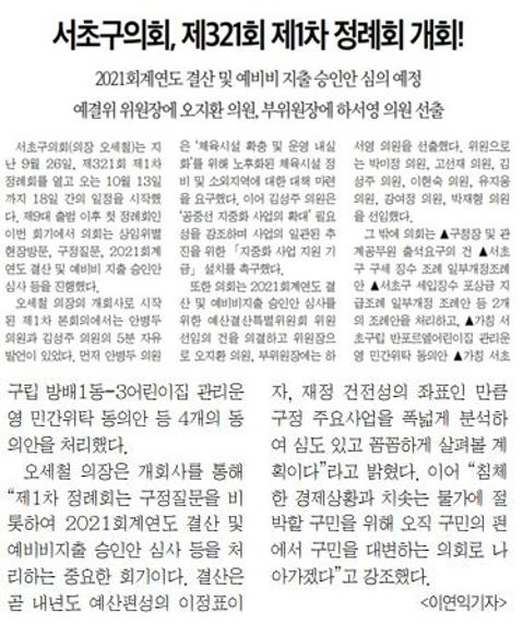 | 언론보도(서초구의회, 제321회 제1차 정례회 개회) 2022.10.11 서초신문 | |||||
