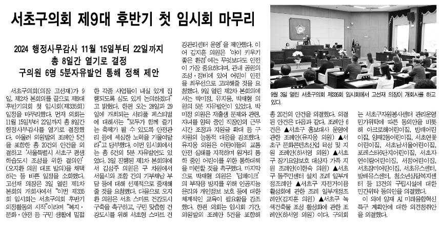 | 언론보도(서초구의회 제9대 후반기 첫 임시회 마무리) 2024.09.19 서초구민신문 | |||||