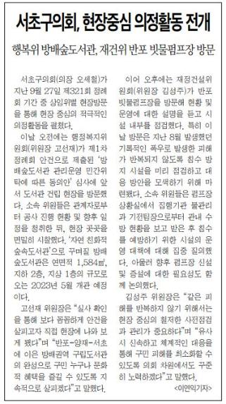 | 언론보도(서초구의회, 현장중심 의정활동 전개) 2022.10.11 서초신문 | |||||