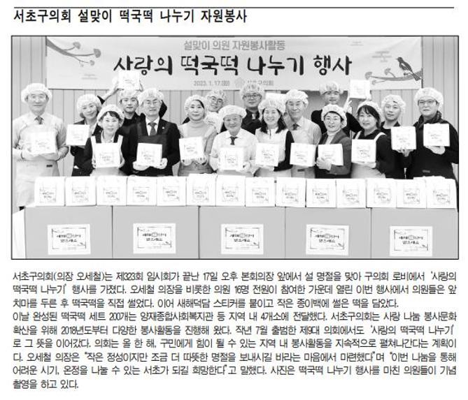 | 언론보도(서초구의회 설맞이 떡국떡 나누기 행사) 2023.01.31 서초구민신문 | |||||