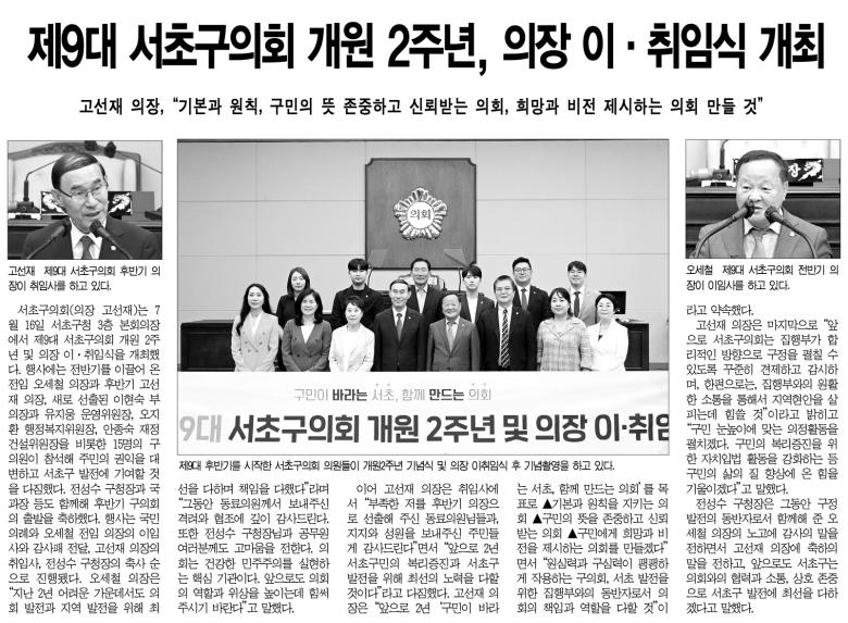 | 언론보도(제9대 서초구의회 개원 2주년, 의장 이-취임식 개최) 2024.07.17 서초구민신문 | |||||