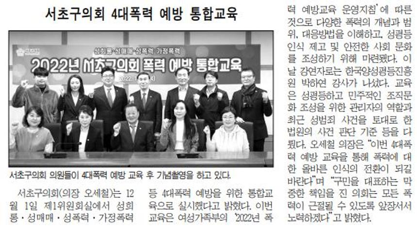 | 언론보도(서초구의회 4대폭력 예방 통합교육) 2022.12.27 서초구민신문 | |||||
