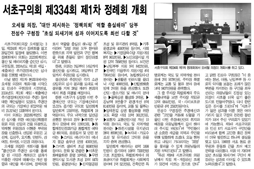 | 언론보도(서초구의회 제334회 제1차 정례회 개회) 2024.06.17 서초구민신문 | |||||