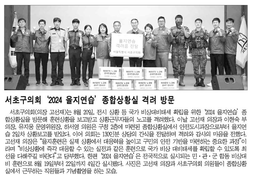 | 언론보도(서초구의회 을지연습 종합상황실 격려 방문) 2024.08.27 서초구민신문 | |||||