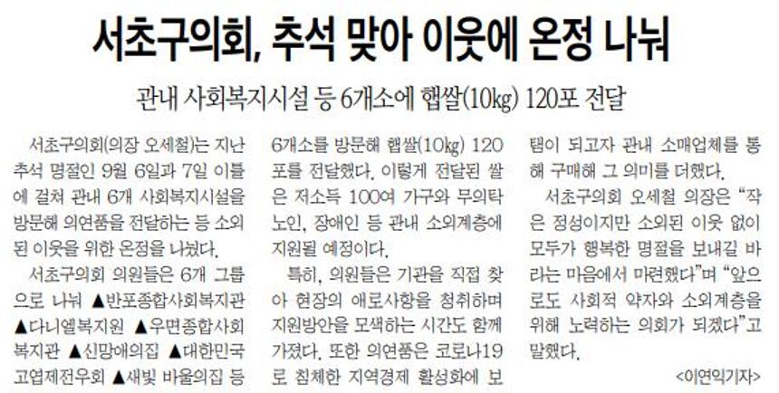 | 언론보도(서초구의회, 추석 맞아 이웃에 온정 나눠) 2022.10.11 서초신문 | |||||
