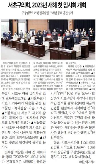 | 언론보도(서초구의회, 2023년 새해 첫 임시회 개회) 2023.01.12 서초신문 | |||||