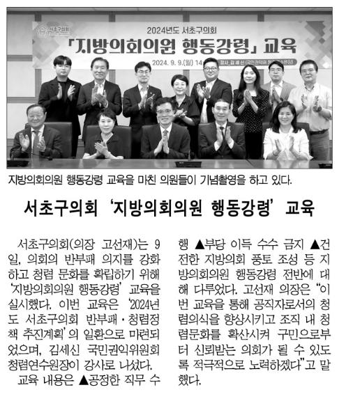 | 언론보도(서초구의회 지방의회의원 행동 강령 교육) 2024.09.19 서초구민신문 | |||||