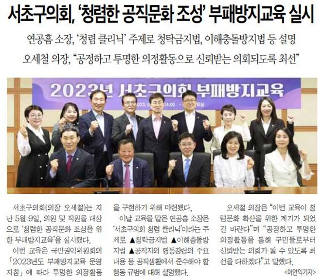 | 언론보도(서초구의회, '청렴한 공직문화 조성' 부패방지교육 실시) 2023.05.23 서초신문 | |||||