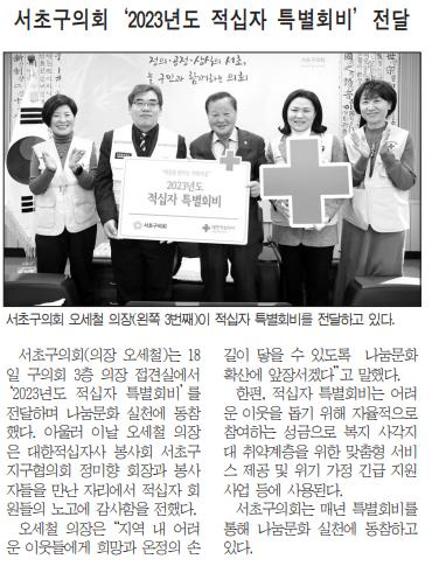 | 언론보도(서초구의회 2023년도 적십자 특별회비 전달) 2023.01.31 서초구민신문 | |||||