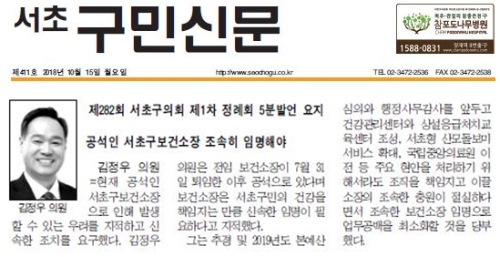 | 언론보도(제282회 서초구의회 제1차 정례회 5분발언 요지...공석인 서초구보건소장 조속히 임명해야)2018.10.15서초구민신문 | |||||