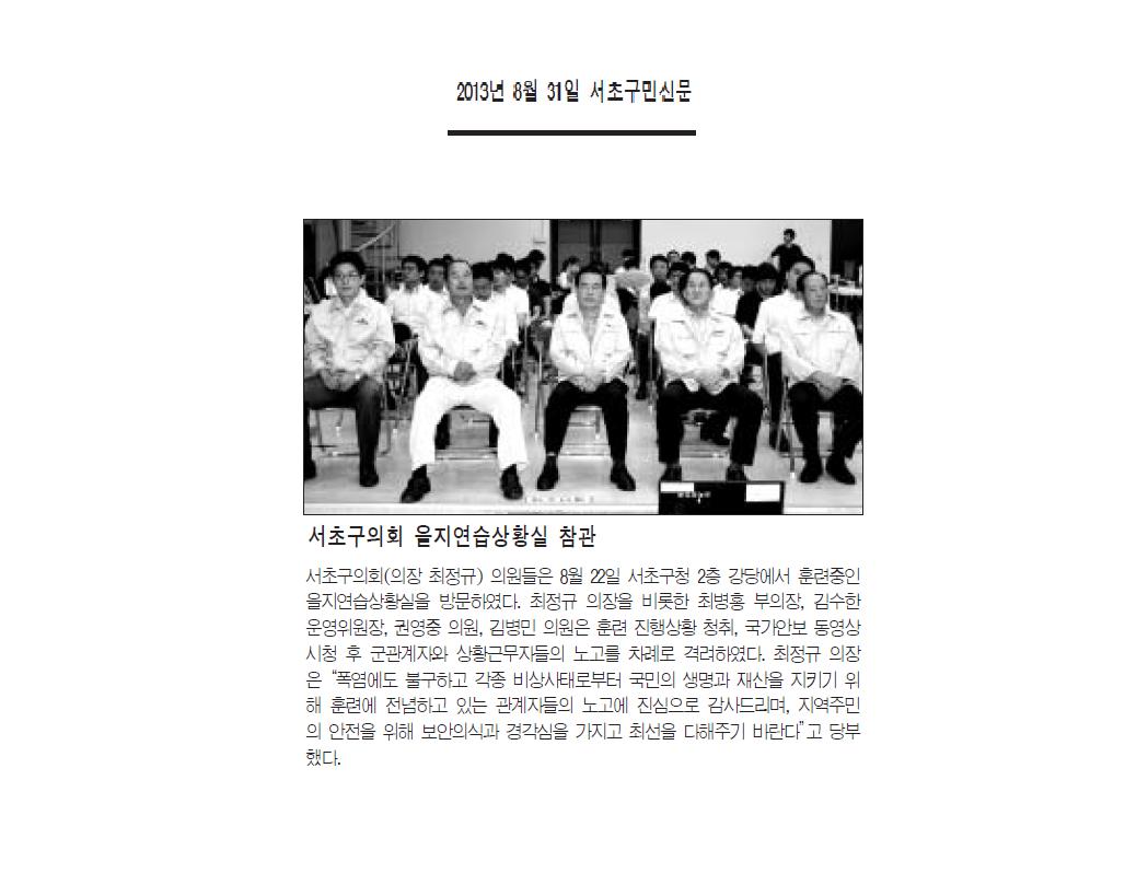 | 언론보도 - 서초구의회 을지연습상황실 참관 - 서초구민신문 (2013.8.31) |